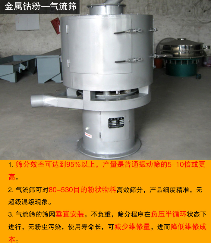氣流篩篩網(wǎng)為圓筒狀,置于機體內(nèi),作業(yè)時鈷粉不是直接投放到篩體內(nèi),而是經(jīng)由一截螺旋輸送機送入,篩箱內(nèi)的分流葉片高速連續(xù)轉(zhuǎn)動,將送入的鈷粉吹起沖向圓筒狀的篩網(wǎng),細料透過篩網(wǎng)進入成品儲料室,粗料從出料口流出。