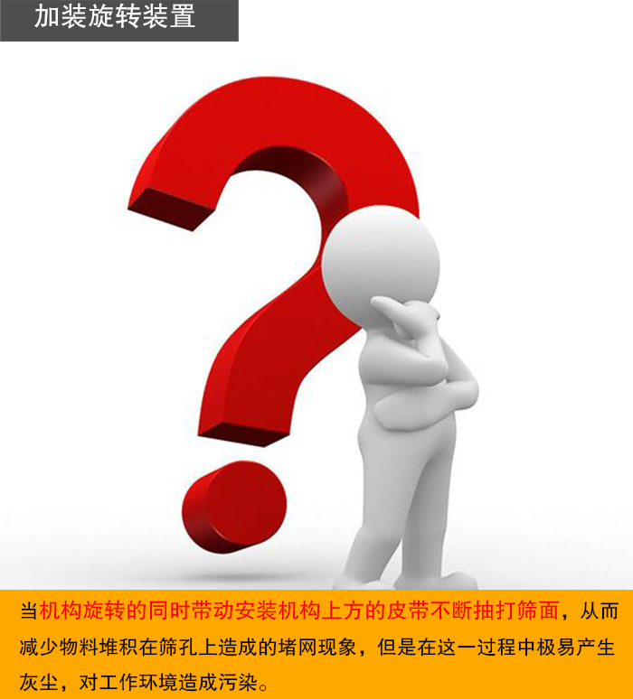 滾筒篩在其固定機(jī)架上加裝帶皮帶的旋轉(zhuǎn)裝置,當(dāng)機(jī)構(gòu)旋轉(zhuǎn)的同時(shí)帶動(dòng)安裝機(jī)構(gòu)上方的皮帶不斷抽打篩面,從而減少物料堆積在篩孔上造成的堵網(wǎng)現(xiàn)象,但是在這一過(guò)程中極易產(chǎn)生灰塵,對(duì)工作環(huán)境造成污染。