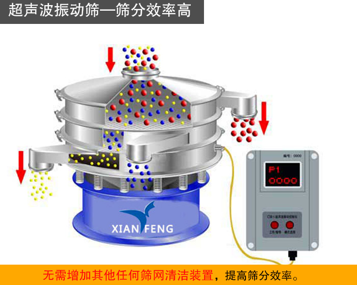 超聲波振動(dòng)篩有1~3層篩網(wǎng)設(shè)計(jì),1套智能超聲波發(fā)生器可同時(shí)使用3個(gè)換能器,產(chǎn)量可提高0.5~10倍,超聲波振動(dòng)篩在篩分粉末、顆粒、漿液類(lèi)物料時(shí)產(chǎn)量是普通振動(dòng)篩的2~10倍。