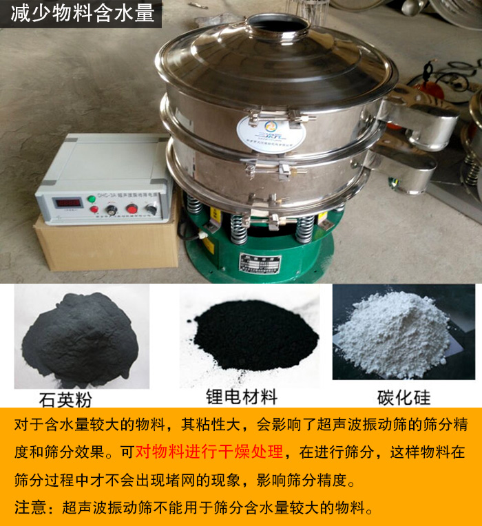 對(duì)于含水量較大的物料,其粘性大,會(huì)影響了超聲波振動(dòng)篩的篩分精度和篩分效果。如果要想取得較好的篩分效果,可對(duì)物料進(jìn)行干燥處理,在進(jìn)行篩分,這樣物料在篩分過(guò)程中才不會(huì)出現(xiàn)堵網(wǎng)的現(xiàn)象,影響篩分精度。這里我們需要提醒的是,超聲波振動(dòng)篩不能用于篩分含水量較大的物料。