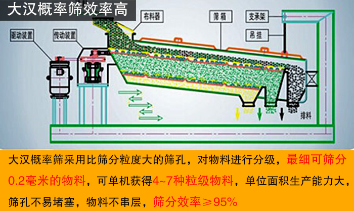 判定產(chǎn)品質(zhì)量的好壞,性能就是一項重要的指標。新鄉(xiāng)大漢廠家在產(chǎn)品性能上也絲毫沒有松懈,其生產(chǎn)的概率篩采用比篩分粒度大的篩孔,對物料進行分級,細可篩分0.2毫米的物料,可單機獲得4~7種粒級物料,單位面積生產(chǎn)能力大,篩孔不易堵塞,物料不串層,篩分效率≥95%。