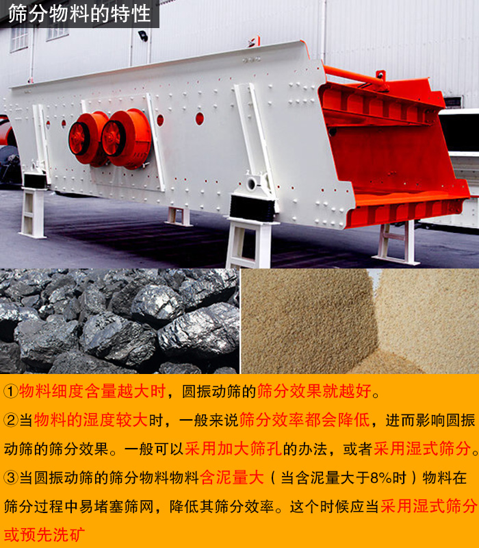 ①圓振動篩為礦用振動篩,所以篩分的物料大都是煤、礦等顆粒狀或大塊狀物料,但是只有物料細度含量越大時,圓振動篩的篩分效果就越好。