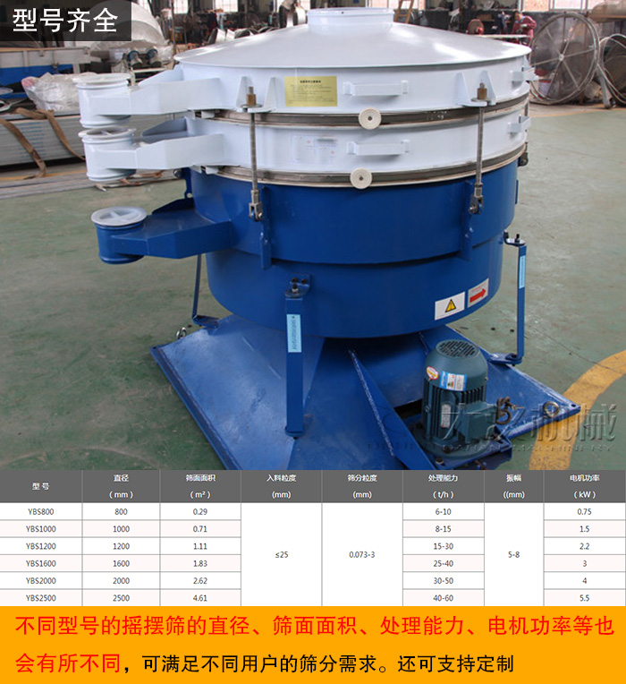 圓形搖擺篩主要型號(hào)有YBS-800、YBS-1000、YBS-1200、YBS-1600、YBS-1800、YBS-2000、YBS-2500,不同型號(hào)的搖擺篩的直徑、篩面面積、處理能力、電機(jī)功率等也會(huì)有所不同,可滿(mǎn)足不同用戶(hù)的篩分需求。還可支持定制。